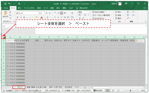 「データ貼付け」のAS列のお名前をコピーしていただき、