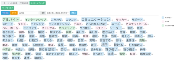 本機能では、学生検索条件を指定すると、ヒットする学生がキミスカに登録しているプロフィールの内容から、パターンや傾向を分析し、特徴となる重要単語を抽出することができます。