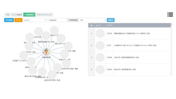 既存社員様の適性検査の結果を蓄積しておくことで、学生検索画面で「どの既存社員様と近い傾向をもつ学生か?」が分かるようになります。